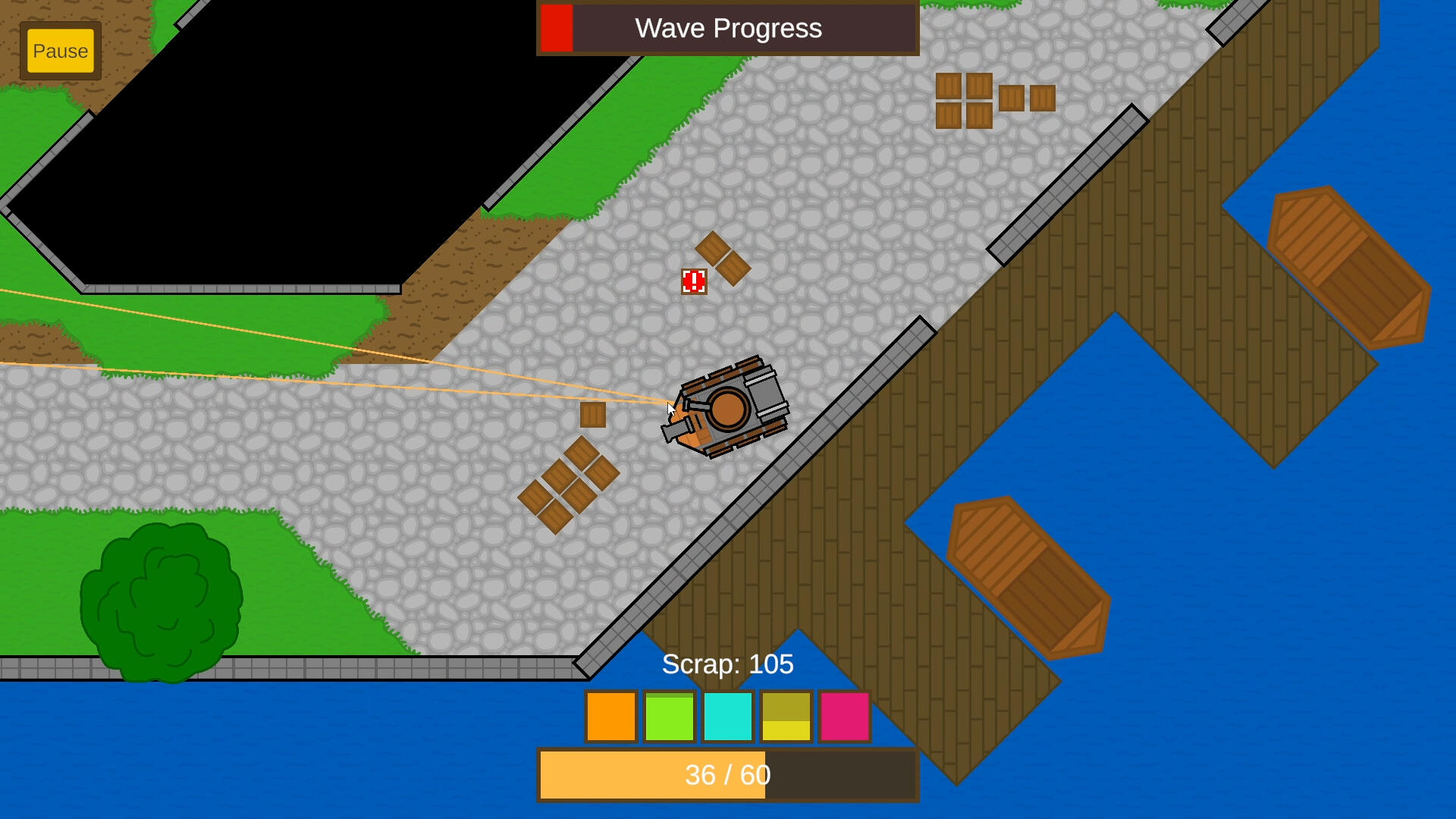To contrast the previous level, this one featured a more structured city environment with lots of buildings for destructible environments, stone walls for persistant blocking, and explosive crates as hazards.Zone 1 uses a Dock with wide paths and a handful of buildings to ease players into the different environment. Stone buildings and more docks were added to allow more space for enemies to spawn.Zone 2 then ups the number of structures, with only a couple of looping paths. Originally there was far too much space, so a section was removed with some buildings converted to stone.Originally the level started with an open outskirts area with only a few structures, but this didn't fit well with the rest of the level and was swapped out for the current Zone 3 - a castle which instead puts the player in a tight, less destructible area for more intense combat.