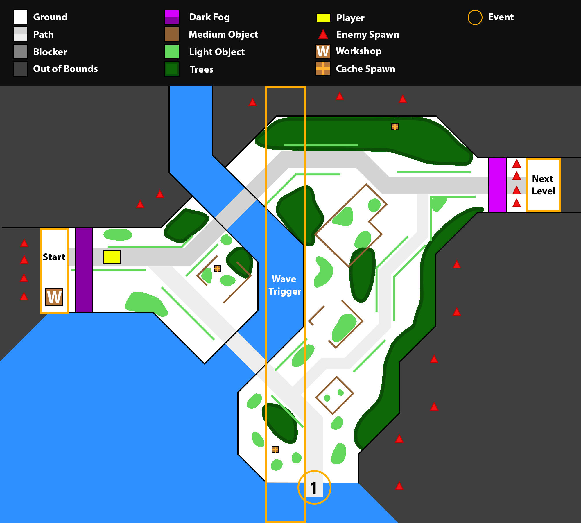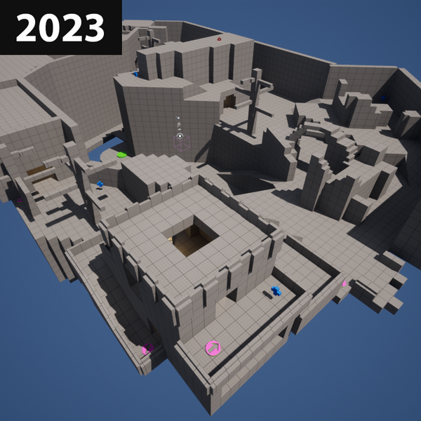 Play testing was done with members of the community, and the layout was iterated until I found something that fit a game designed and balanced around two teams.I also had to navigate game's maximum map size, considering how to give every player equal space without forcing them into a small area.