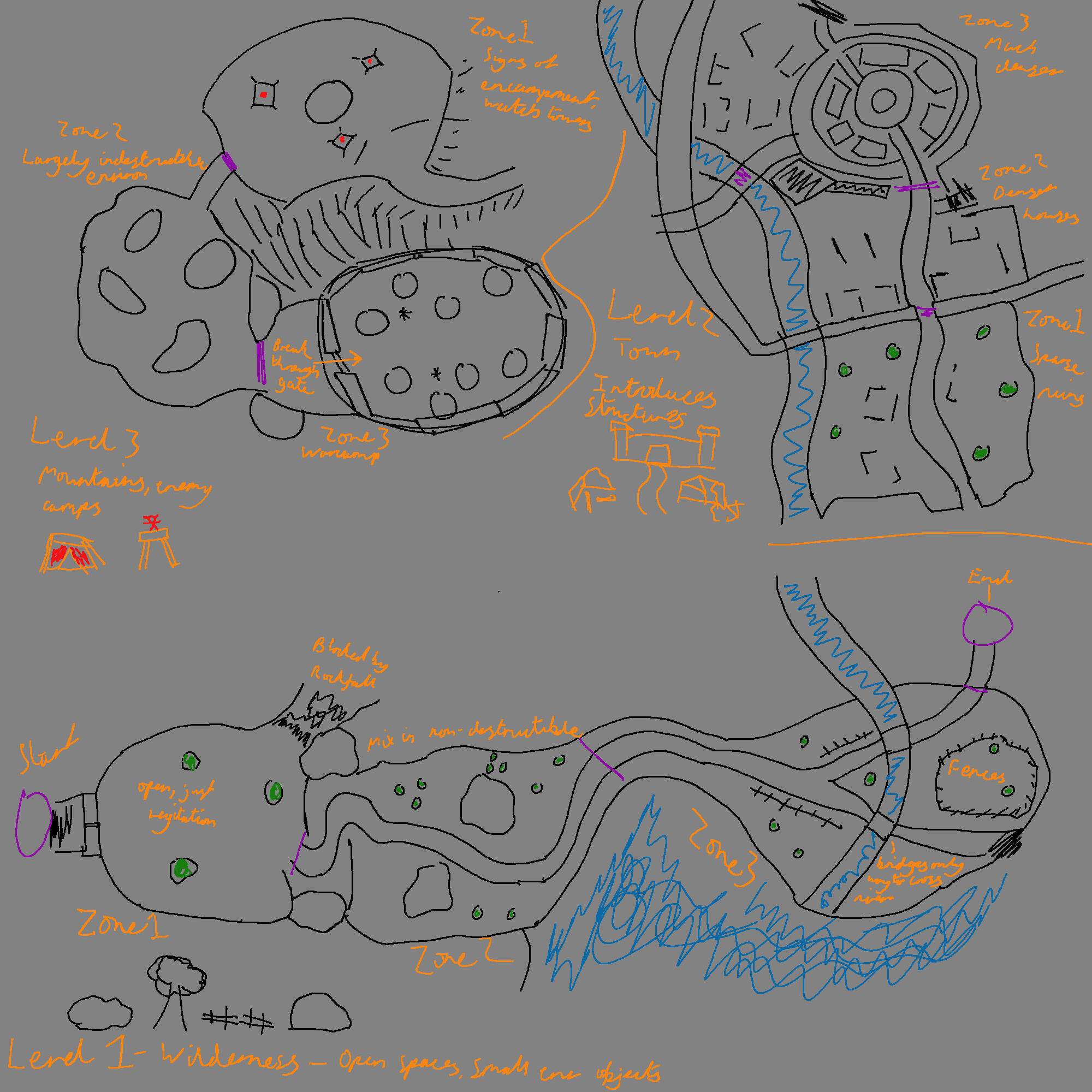 Level 1 focused on natural environments, showing the player's path from their concealed hideout, through overgrown wilderness, and gradually towards ruined civilisation.The first zone started as one main path, with a side road being the main one - this wasn't very intuitive so it was switched to a crossroads where the critical path was clearer.Second a forest - players didn't use the upper or lower areas, so clearer paths that looped into eachother were added.Third, two sections split by a river - the split paths weren't clearly connected, and it was a bit plain, so an extra path was added with more buildings.