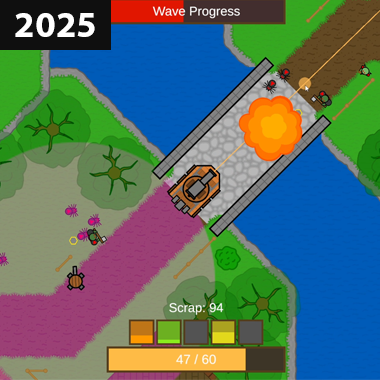 Enginesmith was my 2nd Year Semester 2 project, featuring a medieval-fantasy-themed tank with randomly unlocked equipment and upgrades, plus six zones full of destructible environments to play through.The game is available to download and play on Itch.io Here.Attribution - All audio assets were downloaded from Freesound and Pixabay, and have been attributed Here. All sprites and tilesets were made by myself.