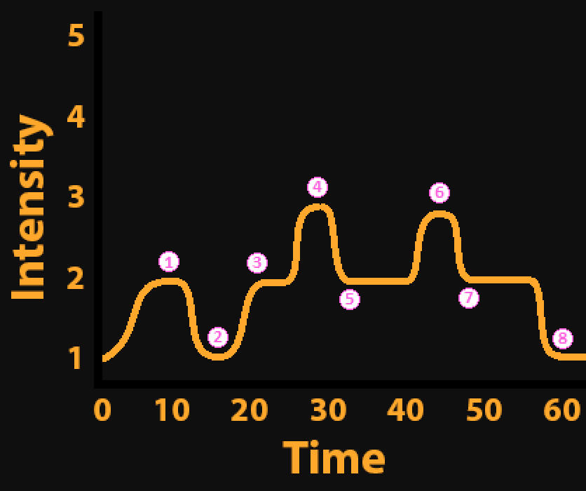 Intensity gradually increases as the player is given time to learn the mechanics, with some pauses included to give the player time to explore or rest.
